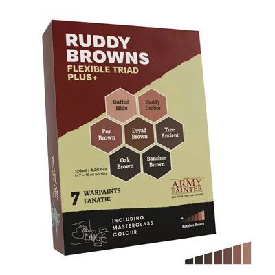 Ce set de peinture comprend non seulement la triade complète de Ruddy Browns, mais aussi une septième couleur complémentaire, Banshee Brown, conçue avec John Blanche pour la série Masterclass de The Army Painter.