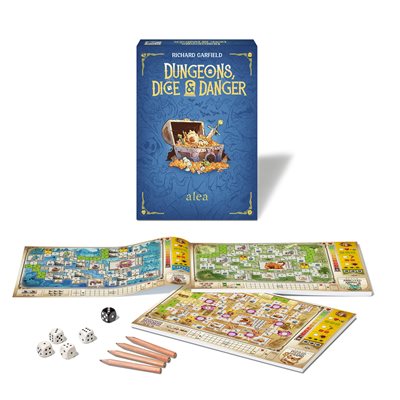 Gather your courage, pack your sword, and roll the dice as you journey through the realm in search of treasure and glory. In the roll-and-write game Dungeons, Dice, & Danger, you explore deep, dark dungeons filled with treasure — and infested with monsters! Do you have what it takes to be a hero of legend?