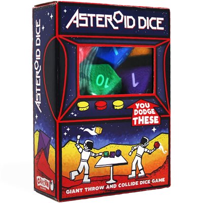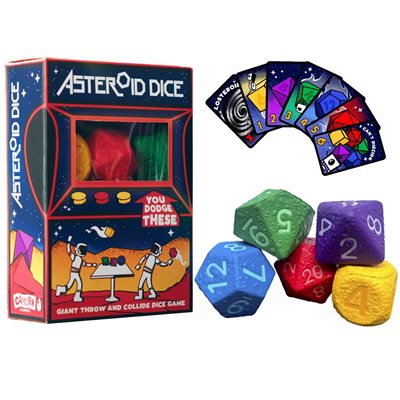 Asteroid Dice est né d'une passion pour les dés et le dodgeball ! Une combinaison risquée ? Nous ne le pensons pas. Il suffit de lancer et de faire s'entrechoquer vos dés mous en mousse pour obtenir le meilleur score à chaque tour et remporter toutes les cartes du champ d'astéroïdes. Vous devez choisir un dé au milieu de la table, mais si vous choisissez le même que quelqu'un d'autre, vous devez alors vous affronter dans un combat de dodgeball pour déterminer qui gardera ce dé et qui perdra sa carte !