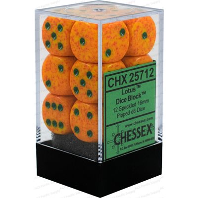 Twelve plastic 16mm Lotus Speckled 6-sided Dice. Lotus Speckled dice are yellow with orange speckles and have green pips.