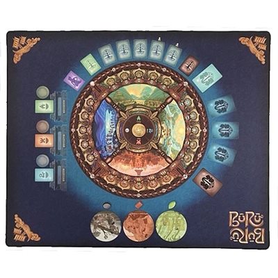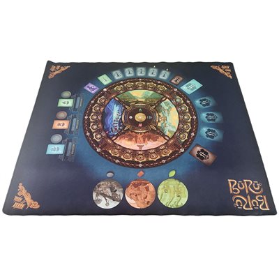 Un tapis de jeu en néoprène pour Buru, présentant le jeu de base sur un côté et le jeu de base plus l'extension Ambleau au verso.