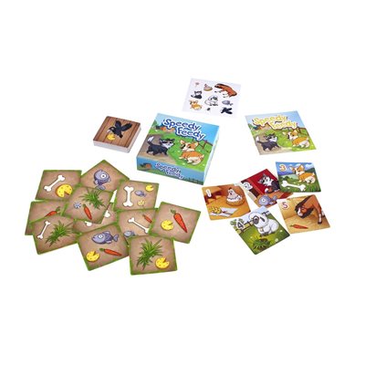 Speedy Feedy is a fun card game for adults and children to develop attention skills. Reveal the food cards, count which food appears the most, and slap the card of the animal that likes this food!