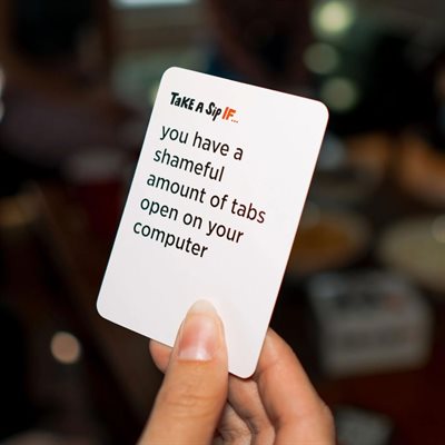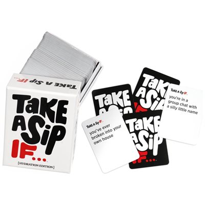 TAKE A SIP IF... est un jeu de fête conçu pour une soirée amusante (ou une sortie) ! Apprenez-en plus sur votre groupe d'amis tout en échangeant des histoires, en vous moquant les uns des autres et, bien sûr, en riant de façon incontrôlable. Ces cartes racontent des histoires et constituent un excellent moyen de briser la glace ou de se rapprocher encore plus de ses amis.