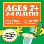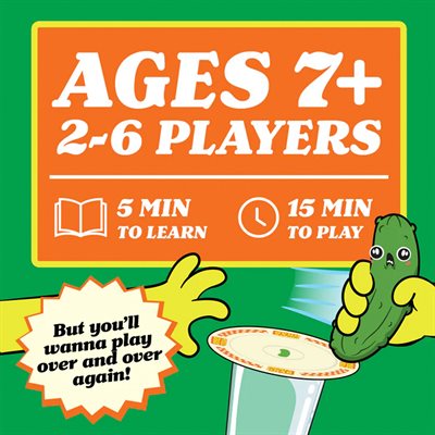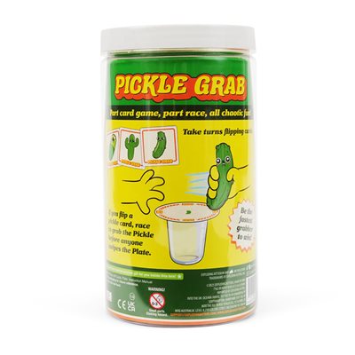 Pickle Grab est à la fois un jeu de cartes, une course et un jeu au nom que vous ne pourrez pas dire sans sourire. Il est conçu de façon experte pour être à la fois compétitif et suffisamment absurde pour faire rire tout le monde (et les faire attraper des objets). Les joueurs retournent des cartes chacun à leur tour, mais dès qu'une carte Pickle ou Assiette apparaît, c'est une course effrénée pour attraper le jouet Pickle ou l'Assiette au centre – avant les autres ! Attention, certaines cartes ne sont là que pour vous tromper et vous rendre plus aigri qu'un jus de cornichon. Attrapez le mauvais objet et vous perdrez des cartes au lieu d'en gagner.