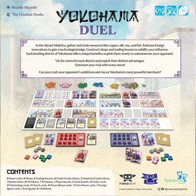 You and your opponent are merchants in Yokohama, trying to succeed in your business ventures and gain prestige to win the game. In order to gain prestige, you will need to fulfill various goals, which involve amassing copper, silk, tea, and fish; mastering foreign technology; and building shops and trading houses.