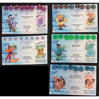 But Mystic Curling Club isn't just dice curling; it's magical dice curling. Each player chooses a witch and her familiar to lead their curling team. On certain shots, you'll be able to change the playing field: adding, moving, or even removing stones!