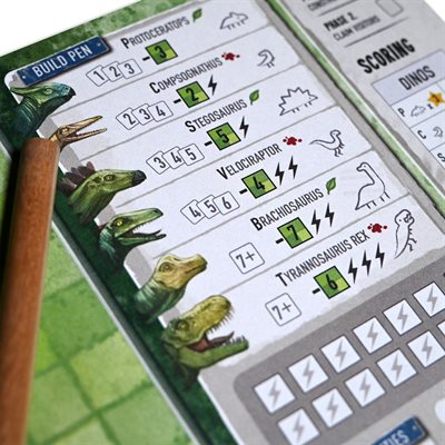 Create your very own Dinosaur Park! You'll need paths, facilities and to fill your park with Dinosaurs if you want to attract visitors. In this roll and write strategy board game you'll be drawing your park on the game sheets, just be careful your dinosaurs don't escape!