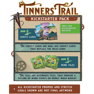 The Kickstarter Pack contains six dual-region survey cards to replace wild cards, and eight mine tiles (with alternate art, as a bonus) that provide either a refund of 1 work point or some money when won in auction.