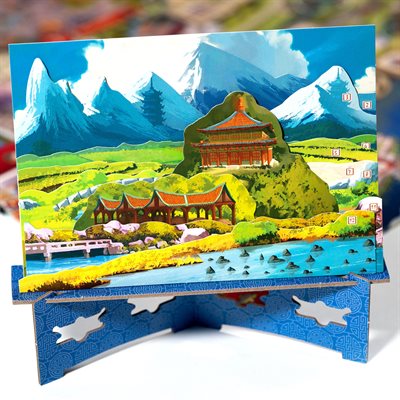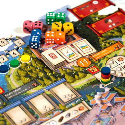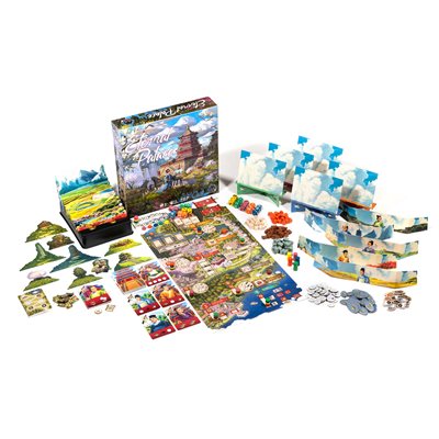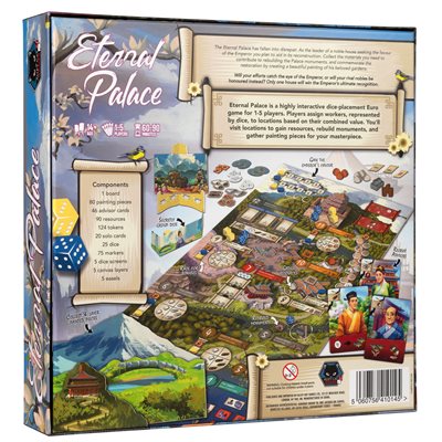 In Eternal Palace your workers are represented by dice, and you'll be placing them to contribute towards rebuilding the different parts of the Eternal Palace. This is a highly interactive Euro with many of the locations on the board giving players the ability to gain the edge over their opponents by completing tasks first, or contributing more to monuments to earn tokens reflecting their overall efforts.