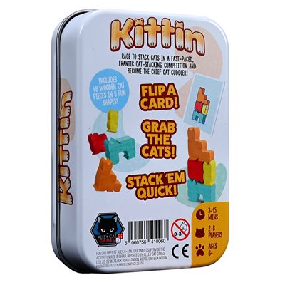 Kittin is an easy to learn, fast-paced and fun dexterity game for all the family. Flip a card, grab your cat meeples, and get building! The quickest player will win the cat-stacking race! Increase the fun with hilarious team rules!