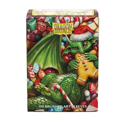 The 2024 Dragon Shield Christmas Brushed Art sleeves feature mischevious dragons endulging in seasonal sweets.