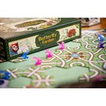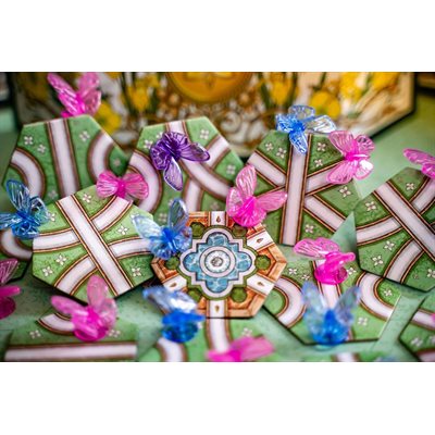 Butterfly Garden is a tile-laying game along the lines of Metro, Tsuro, and Linie 1 in which players build paths bit by bit, with no player owning the individual paths and everyone trying to exploit the paths already present. Unlike those earlier games, however, your goal is to move butterflies from their starting locations on the board to your designated flowerbeds, with the player who scores the most points winning the game.