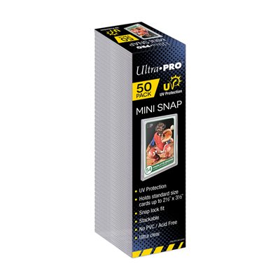Holds 2-1/2" x 3-1/2" (63.5 mm x 88.9 mm) standard size cards with UV Protection. Two-piece ultra clear holders with snap-tight closure and minimal trim. Can be stacked for easy storage and transport. This holder provides UV- Resistant, No-PVC and acid free protection. Value pack comes with fifty (50) individual UV Mini Snaps. (cards not included)UV Protection, No PVC & Acid FreeHolds Standard size cards up to 2-1/2" x 3-1/2"Snap-lock fit & stackableUltra clearValue pack bundle includes fifty (50) individual UV Mini Snaps
