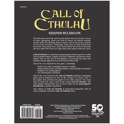 This book contains the core rules, background, guidance, spells, and monsters of the game. It is everything you need for Call of Cthulhu at your fingertips, and will enhance all of your games. The Keeper Rulebook is intended for use by the Keeper of Arcane Lore—the Game Master who will present the scenarios to the other players.