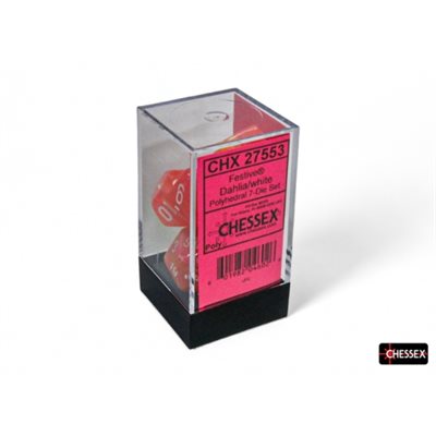 This set contains 7 Festive Dahlia dice with white numbers with the following shapes: