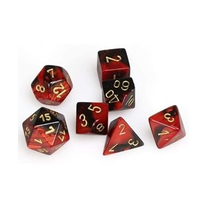 Contains 7 Gemini Black-Purple Dice with gold numbers in the following Shapes: \