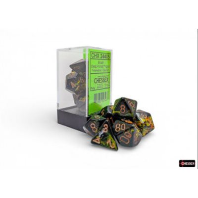 This set contains 7 Brush Deep Forest dice with gold numbers with the following shapes: