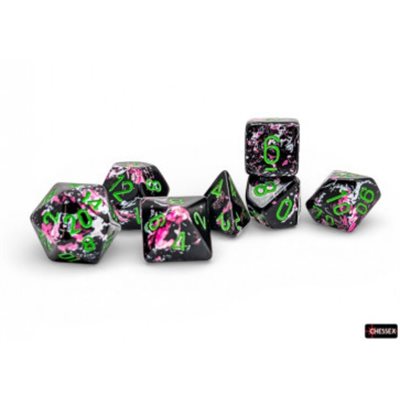 This set contains 7 Brush Paintball™ dice with green numbers with the following shapes: