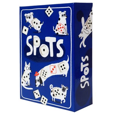Spots is a game about rolling dice, pushing your luck...and dogs! You’ll roll and reroll, trying to place dice on the matching spots on your dogs. You get to laugh at your friends when they take a big risk and bust. And they get to laugh right back at you for doing the same thing.