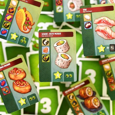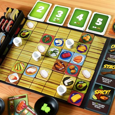 Each turn, add a new ingredient to the shrinking kitchen space and try to arrange them for the orders you're working on. Complete a scrumptious recipe for points or take an action card like Chop!, Stack!, or Switch! to help with future turns. Don't forget to collect spicy wasabi to complete orders with style! At the end of the night, the chef who has earned the most points by completing their recipes wins!