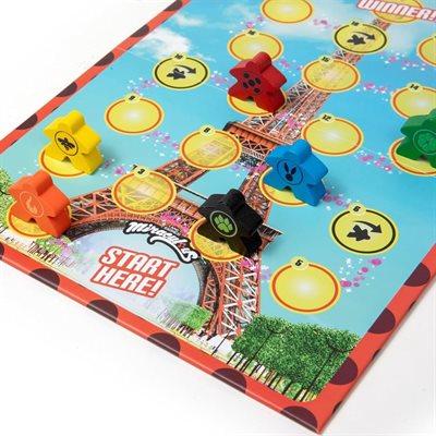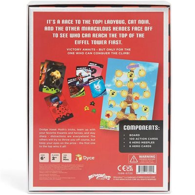 Miraculous: Rate To The Top of the Tower is an exciting family game for 2 to 6 players. Who will be the first Miraculous here to reach the top of the iconic Eiffel Tower? Play the game to find out! Get help from your favorite Kwamis, but beware - the villainous Hawk Moth is out to stop you! Full of characters and situations from the hit show, this game is sure to delight fans of all ages. Game includes 6 full color standees, a deck of cards plus a board featuring the Eiffel Tower.