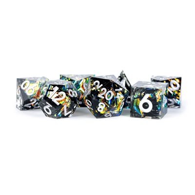 Our handcrafted, sharp edge resin dice are hand polished to keep their beautiful sharp edges. These dice are infused with beautiful glitter flakes. Because these dice are not tumbled, they are more precise than mass produced resin dice. Its hard to beat the value in our resin dice sets. Beautiful and affordable, these are great Critical Reinforcers to our metal dice. Each 16mm polyhedral set comes with 7 dice (d4, d6, d8, d10, d10 (00-90), d12, and d20).