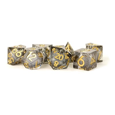 From FAnroll's innovative Kickstarter, Elixir dice are infused with glittery liquid cores that swirl when rolled. Each set is handcrafted and polished to keep their beautiful sharp edges. When the liquid cores are molded into the dice, the heat from molding creates a small bubble in the liquid core. Since the bubble in the liquid is constantly moving, we have not seen an effect on rolling. Sharp edge d4’s have small liquid cores that are more difficult to center, but we have not seen an effect on rolling. These full-sized polyhedral dice sets come with 7 dice (d4, d6, d8, d10, d10%(00-90), d12, and d20).