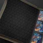 Padded leatherette cover with textured material card storage pages and matching zipper closure with expansion set symbol