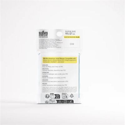 Our answer to entry-level sleeves. Just Sleeves – Mini American-Sized are a cost-effective option designed to protect board game cards.Measuring 46 × 71 mm, these sleeves are perfect for games with Mini American size cards. This size also matches the Gamegenic Prime line of yellow color sleeves.Each pack contains 50 sleeves.