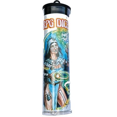 A complete set of 14 dice for DCC RPG! The dice are a glittering multi-colored swirl of rose, green, ultramarine, and yellow with gold numbers.