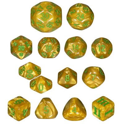 Includes all the dice required for DCC RPG: d3, d4, d5, d6, d7, d8, d10, d12, d14, d16, d20, d24, and d30, plus a percentile d%.
