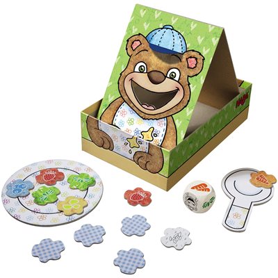 In Hungry As A  Bear, players arrange the servings on the plate, roll the die and use the spoon provided to feed him the food that matches the picture on the die.