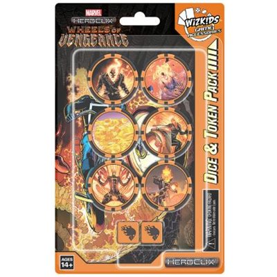 HeroClix Dice and Token Packs contain 2 custom dice featuring a special logo to match the set, and 6 action tokens featuring rubber-burning riders like Johnny Blaze, Robbie Reyes, and Danny Ketch! On the reverse side of these action tokens, players can find Bystander tokens to use with figures in the set to help complete their Marvel HeroClix: Wheels of Vengeance collection.
