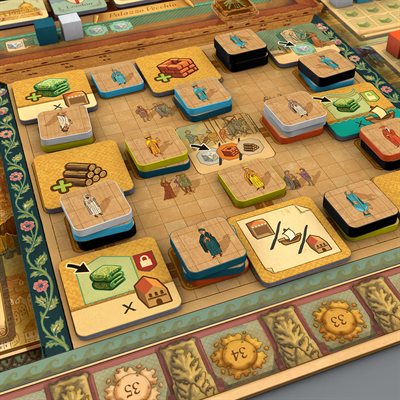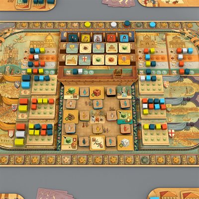 Promote your trusted family members into the Council of Calimala, triggering scoring and the evaluation of prestige in the next area of the board. Plan ahead for upcoming scoring conditions and hire contractors to take advantage of open opportunities.