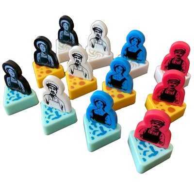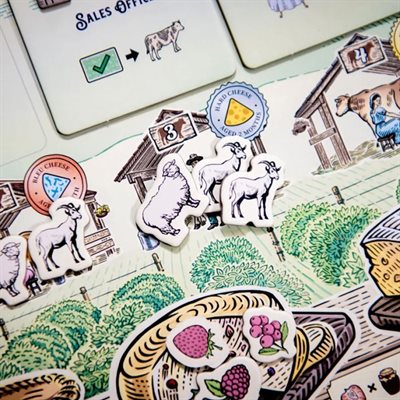 You are a French cheesemaker in the early 20th century making, aging, and selling your artisan cheeses. Become the most prestigious cheesemaker in France by running a highly, successful creamery and crafting exceptional cheese. Fromage is a simultaneous worker-placement game where each player makes cheese and gathers resources from the quadrant of the board facing them. Once all players have placed their workers, the board rotates, aging any cheese that was made, and presenting each player with a new location. Since all players take tums at the sarne time, Fromage condenses the feeling of a highly strategic Euro-style game into just thirty minutes.
