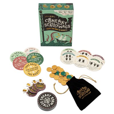 This daring game of bluffin’ and bold moves will have pirates young and old guessin’ who’s hidin’ the gold. Watch closely as yer rivals perform sneaky hand gestures like Swab the Deck and Sails Up in this boisterous dexterity game.