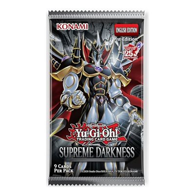 The king is not amused... but he will be – and so will you! – with the brand-new "Evil HERO" monsters coming in Supreme Darkness!The "Evil HERO" monsters of Supreme King Jaden are back in full force! The evil versions of the Elemental Heroes Bubbleman and Prisma make their debut, along with the new version of Supreme King Neos, who has the power to take control of your opponent's monsters! The "Evil HERO" fusion monsters are not in short supply, and this set adds even more, along with new support cards to make things easier.If you're looking for something faster, it's time to get into action with the new "Speedroid" cards that make Synchro Summoning a breeze! There are two new Pendulum/Tuner Speedroid monsters, plus some new Synchro monsters inspired by Yugo's favorites, including the largest Synchro Dragon "Clear Wing" to date. Put the pedal to the metal and leave your opponents in the dust!Synchro Summoning fans can also grab new "Crystron" monsters, including a new Synchro monster. Keep an eye out for a new Level 2 tuner that can Special Summon a "Crystron" every time your opponent activates an effect, and then immediately perform a Synchro Summon!And a brand-new theme that has mastered the art of bouncing back onto the field makes its debut in Supreme Darkness. This deck works by placing its Continuous Trap Monsters directly into your Spell & Trap Zone. As face-up Continuous Traps, they provide constant buffs to all your Warrior monsters. But whenever you wish, these Trap cards can come to life as Warrior monsters and then bounce back into the Spell & Trap Zone when things get too heated, ready to reappear at the right moment.Expect all this and much more to emerge from Supreme Darkness!Supreme Darkness contains a total of 101 new cards, including a brand-new, world-premiere theme you won’t want to miss. It also continues the 25th Anniversary celebration with 25 Quarter Century Secret Rares, including a special card!