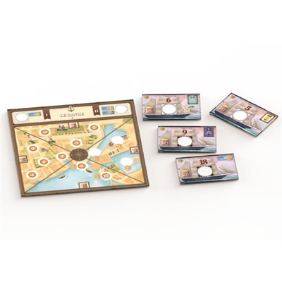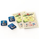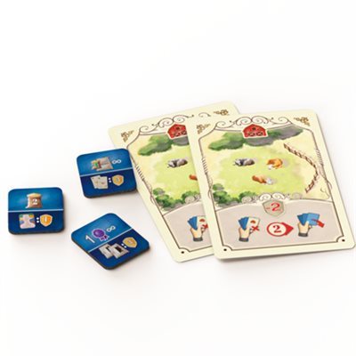The player board features a new type of worker — farmers — and different paths await on the game board to confront you with more choices. Will you take the road with buildings or a path past farmers? Maybe you'll have the chance to use your cows — well, the strength on your cow cards — to help farmers, getting them on your side and adding grain, a new type of resource, to your income, with grain being used for boat and city tiles.