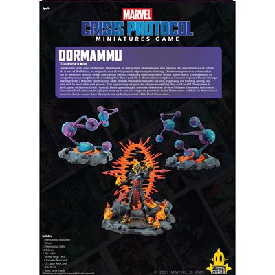 This expansion pack provides players everything they need to add Dormammu to their games of Marvel: Crisis Protocol. This expansion pack includes rules for an all-new Ultimate Encounter. In Ultimate Encounter: Dark Intruder, two players team up in one last desperate gamble to defeat Dormammu and halt his dimensional incursion before he can draw their universe under the control of his Dark Dimension.