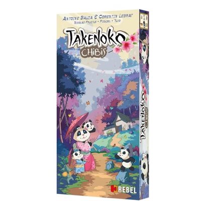 Takenoko: Chibis includes a miniature of the female panda, nine different tiles for the baby pandas, six plot tiles, 18 cards, and 17 bamboo pieces.