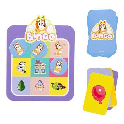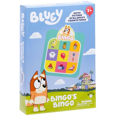 Bluey loves to create and play unique games with her family and friends and now kids can too with Bingo's Bingo! Match pictures of Bluey and Bingo's world! Call out the images on the Calling Cards. When an image matches your Bingo Card place a Bingo Chip over it. The first player to get three Chips in a row on their card and yell BINGO wins the round and a Scoring Chip. Win three Scoring Chips and you win the game! Bingo's Bingo is an exciting and fun game for anyone aged three and up!