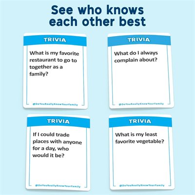 "Do You Really Know Your Family?" You'll find out when you and your family get together and play this easy and fun card game! See who really knows the family best as you answer fun trivia questions about each other! Create hilarious family memories as you perform and complete silly challenges together to be the first player to collect 15 game cards! "Do You Really Know Your Family?" is the perfect game for families with kids ages 8 and up, teens and adults. So easy to learn and play, "Do You Really Know Your Family?" contains 2 sets of playing cards - Trivia and Challenge. Draw a Trivia Card and read the question about yourself out loud. The first person to guess the answer you are thinking of wins the card! Challenge Cards have silly and fun challenges and games for the family to perform together. Complete the challenge and score another card! Share the laughs as you all learn things about each other that you never knew! It's wholesome fun for everyone. "Do You Really Know Your Family?" is an ideal game for family game night as well as making a great party game. With 200 different cards in the box, there's plenty to learn about everybody and heaps of silly challenges to perform.