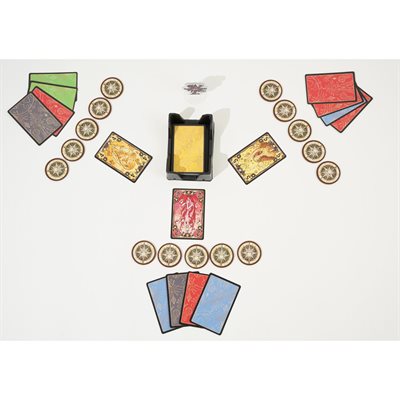 Stella Quest is a trick-taking game with a unique twist. If a player collects all six different emotions, they win the game. To win a human emotion, you must win the trick. By winning a trick, you win an emotion, but you also attract the Black Star's attention. If you win a trick while the Black Star is watching you, the Black Star will consume your light (life). All players start with five lights, and if a player loses all of their lights, they lose the game.