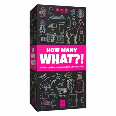 Did you know that a T-REX is 8 PEACOCK FEATHERS tall and that a BLUE WHALE weighs as much as 21 SCHOOL BUSES?Some people will use anything but the metric system to measure things! How Many What?! is the ridiculous party game of absurd comparisons.