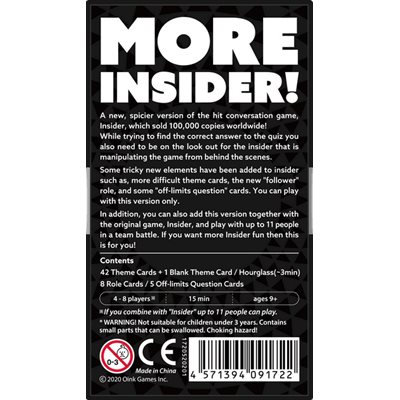A new, spicier version of the hit conversation game, Insider, which sold 100,000 copies worldwide! While trying to find the correct answer to the quiz you also need to be on the look out for the insider that is manipulating the game from behind the scenes. Some tricky new elements have been added to insider such as, more difficult theme cards, the new "follower" role, and some "off-limits question" cards. You can play with this version only. In addition, you can also add this version together with the original game, Insider, and play with up to 11 people in a team battle. If you want more Insider fun then this is for you!