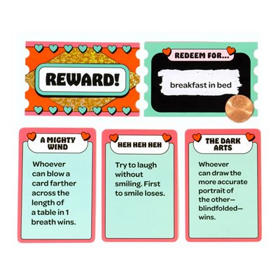 How to play: Compete in fun, fast-paced challenges against your partner, from silly dares to creative tasks. Win a challenge, keep the card. The first player to collect 5 winning cards earns a scratch-off reward ticket revealing a surprise prize! Along the way, you’ll also draw “Just for Fun” cards, which offer sweet breaks from competition that spark laughter and connection.