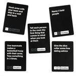 Includes 200 cards with challenges like “Name 3 bald people,” “Have the 2 shortest people hold hands, then limbo under them,” and “Lick something.” 2 dice are also included in the box.