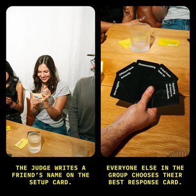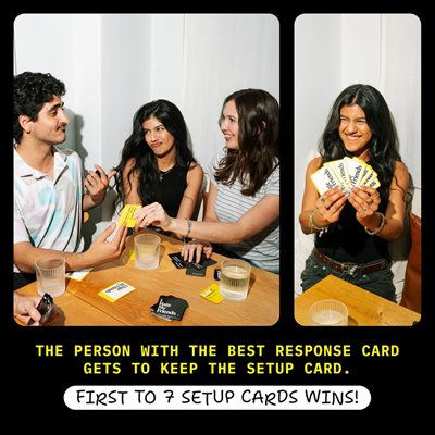 How to play: Gather 3 or more people you think are your friends. Your loudest friend goes first as the judge. The judge draws a Setup card and writes a friend’s name (or their own!) in the name blank. Everyone else in the group picks the best Response card from the 5 in their hand and places it face down in the middle. The judge reads each Response card out loud and picks their favorite one. The person with the best Response card gets to keep the Setup card. First to 7 Setup cards wins.