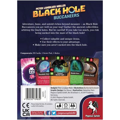 Great adventure, fame, and untold riches - all this is waiting for the Black Hole Buccaneers. In this fast-playing card drafting game, players must collect treasures from the orbit of black holes, which were dumped there hundreds of years ago as mankind's garbage. Among the items to be found are artifacts and relics that have powerful effects, as well as toys that are not particularly valuable in the year 2642, but are in great demand by other species. In exchange, these extraterrestrial beings offer help to escape from the black holes into which players will be drawn if they collect too much space debris.Whoever manages to escape the black hole in the scoring phase of a round gets to score their collected items and thus moves a little closer to victory. After three rounds, the player who best navigated the dangers of outer space while also collecting the most valuable items will win.Black Hole Buccaneers is a full of dynamic card play and lots of player interaction. The large variety of debris cards and variety of special card effects will force players to make difficult decisions every round.