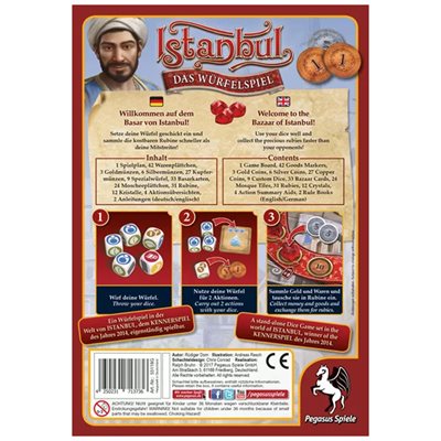 Istanbul: The Dice Game (Das Würfelspiel) is a standalone dice game in which players are once again plunging into the bustle of Istanbul's bazaar to collect rubies and thus secure their victory. By cleverly using the dice, the players can make money and goods, then exchange them for the precious jewels.